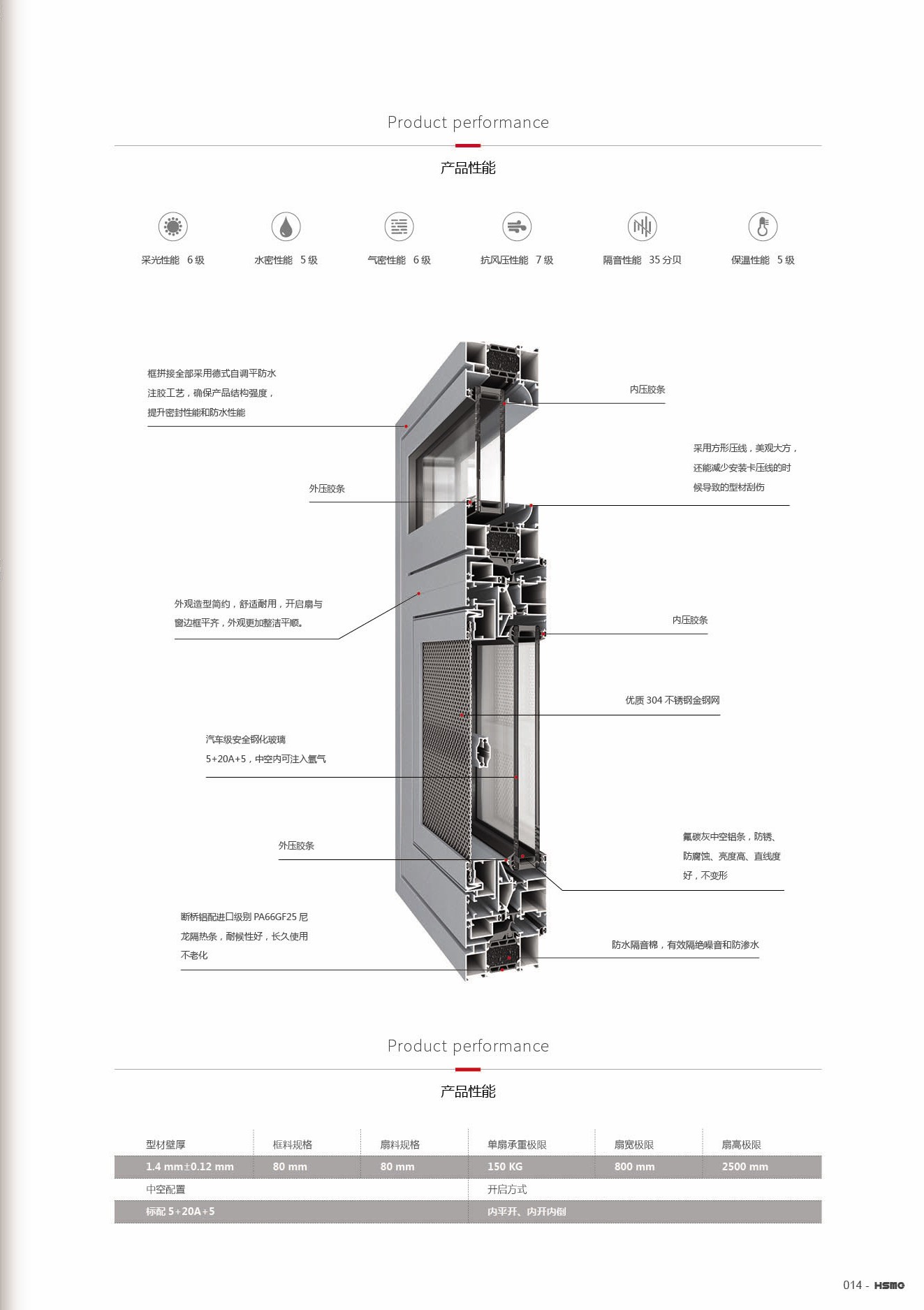【產品系列】:塞納 【產品性能】:水密性能5級、隔音性能≥35DB、氣密性能6級、抗風壓性能8級、保溫性能K≤2.5 【產品結構】:采用6063-T5鋁材,防水軌隱藏排水結構,四道防撞膠條密封設計,5+20A+5中空玻璃 【五金配件】:標配好博窄邊暗鎖